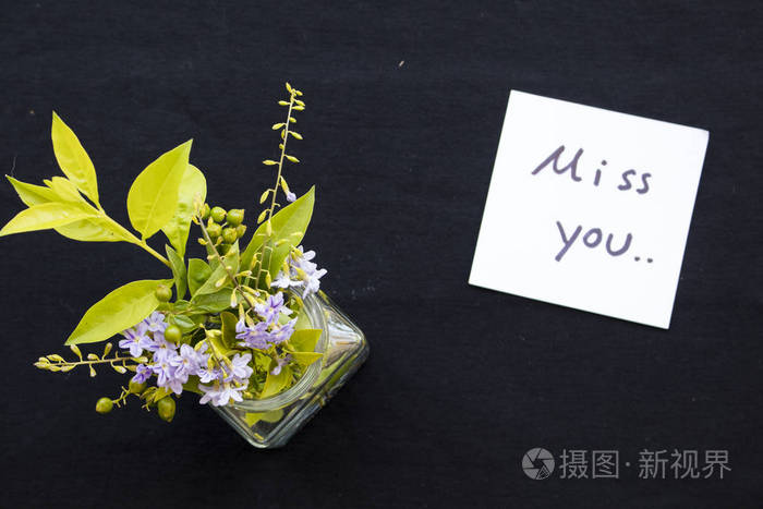 我想念您信息卡片与紫色花在瓶在背景黑照片 正版商用图片06tt71 摄图新视界